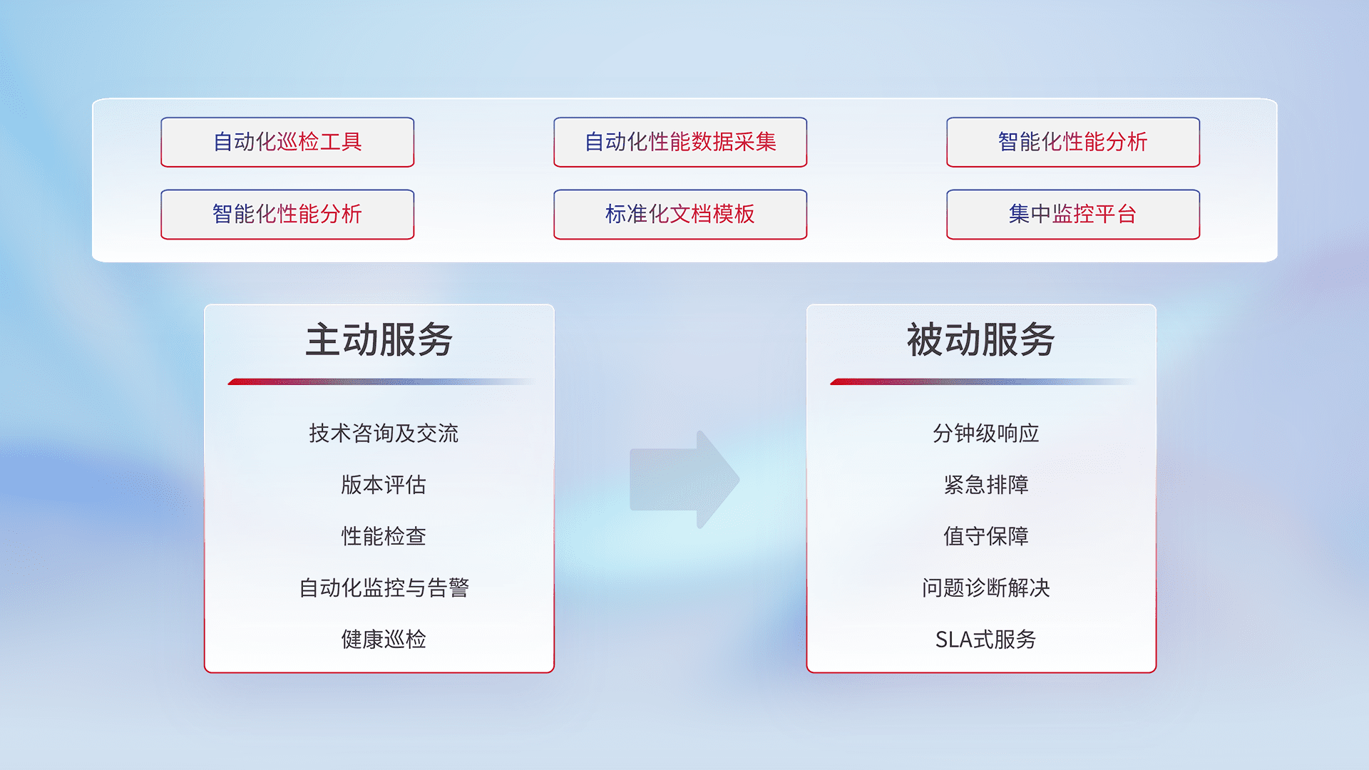 智能化工具和标准化文档,,,保障服务质量,,,提供主动服务(包含技术咨询、、、、版本评估、、性能检查、、、自动化监控与告警、、、、健康巡检)和被动服务包含(分钟级响应、、、紧急排障、、值守保障、、、问题诊断解决、、、SLA服务)。。