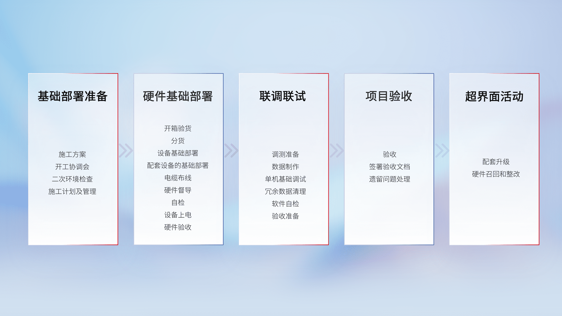 从基础部署准备、、、硬件基础部署、、、联调联试、、、项目验收、、、、越界面活动的全过程可追溯,,保证施工质量和进度。。。。