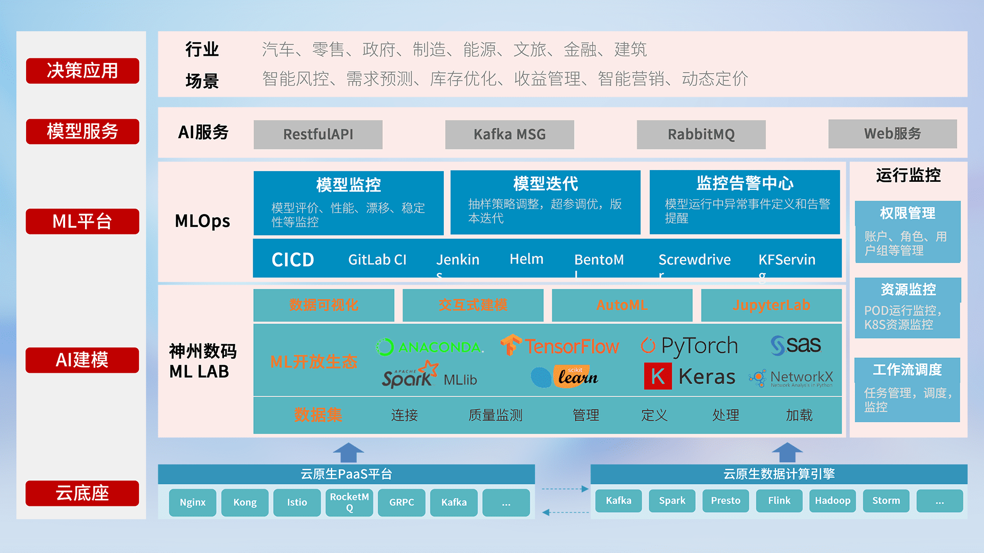 数据+模型双引擎驱动,,面向智能服务场景,,快速灵活利用AI技术,,,,支持业务决策,,助力企业智能化转型破局。。